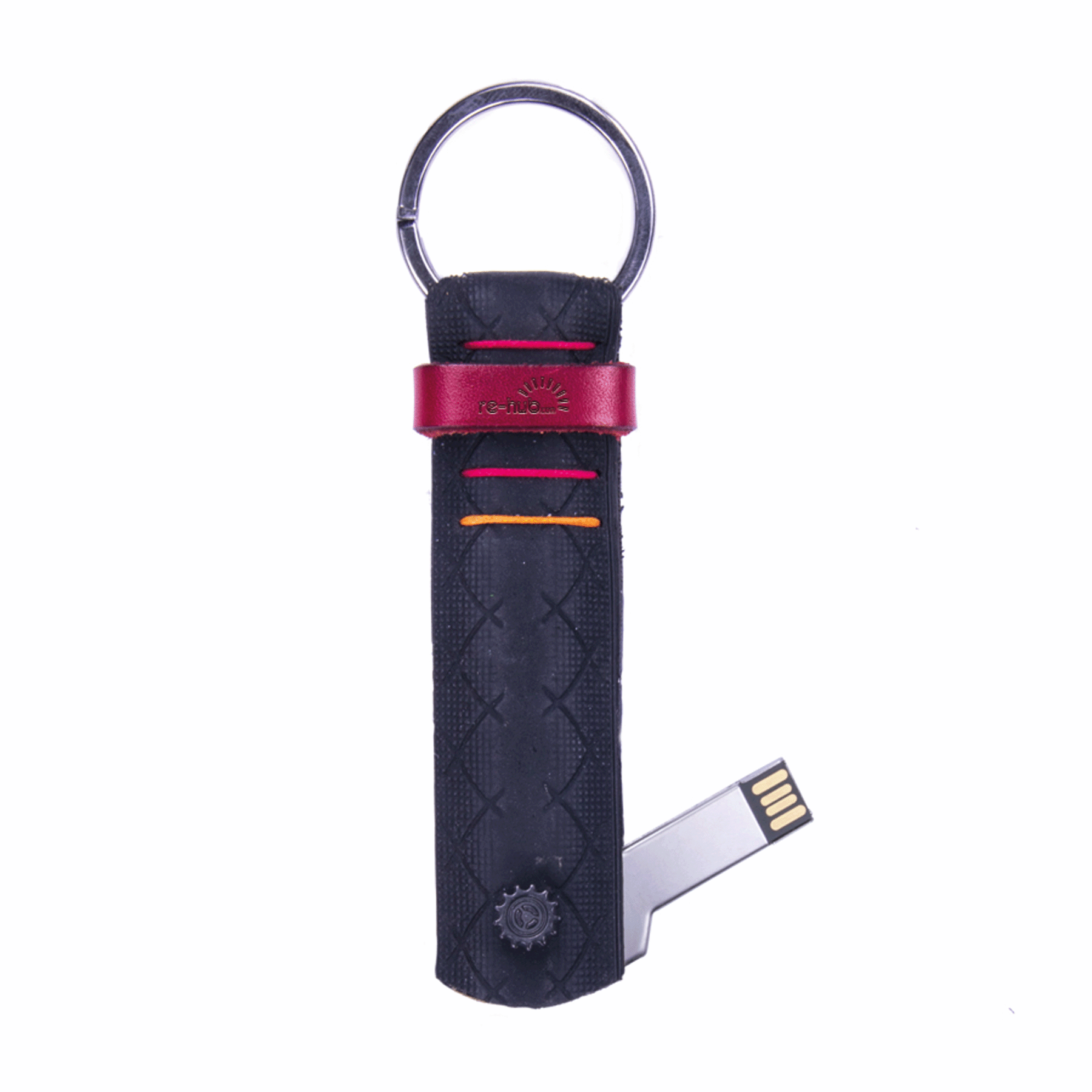 Schlüsselanhänger bestehend aus einem Riemen aus recyceltem Fahrradreifen, genäht mit farbigen Schnüren und mit einer Gürtelschlaufe aus Leder versehen. In verschiedenen Farben erhältlich. Enthält Deinen Schlüssel und verbirgt eine Besonderheit: einen USB Memory Stick 4 GB